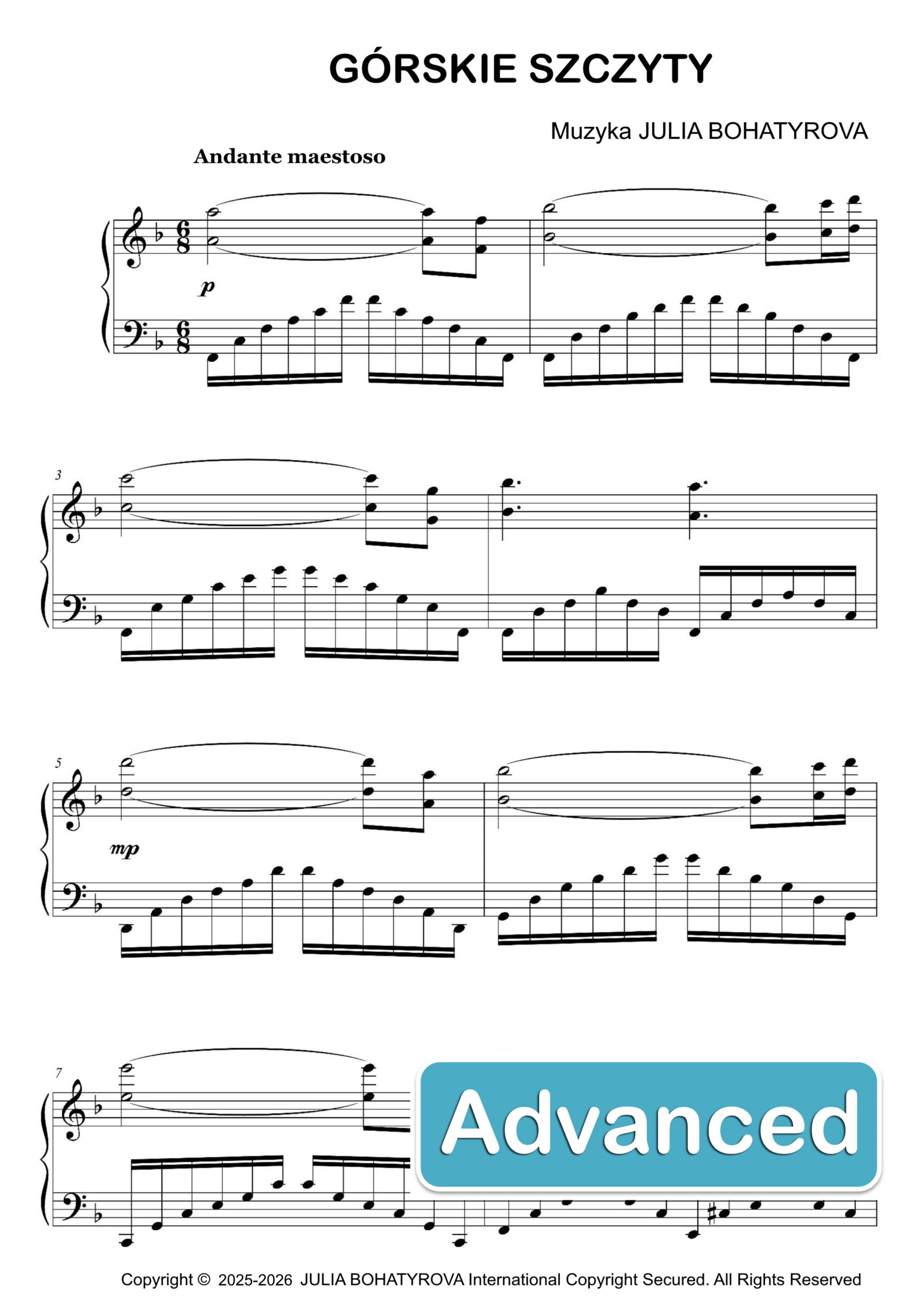 „Górskie Szczyty” – utwór fortepianowy solo w formacie PDF. Autorka: Yulia Bohatyrova. Trzystronicowa, potężna kompozycja dla pianistów zaawansowanych, łącząca dramatyczne kontrasty, rozległe harmonie i wirtuozowskie pasaże. Utwór oddaje majestat gór, stawiając wykonawcy wymagania zarówno techniczne, jak i ekspresyjne. 🎹⛰️
