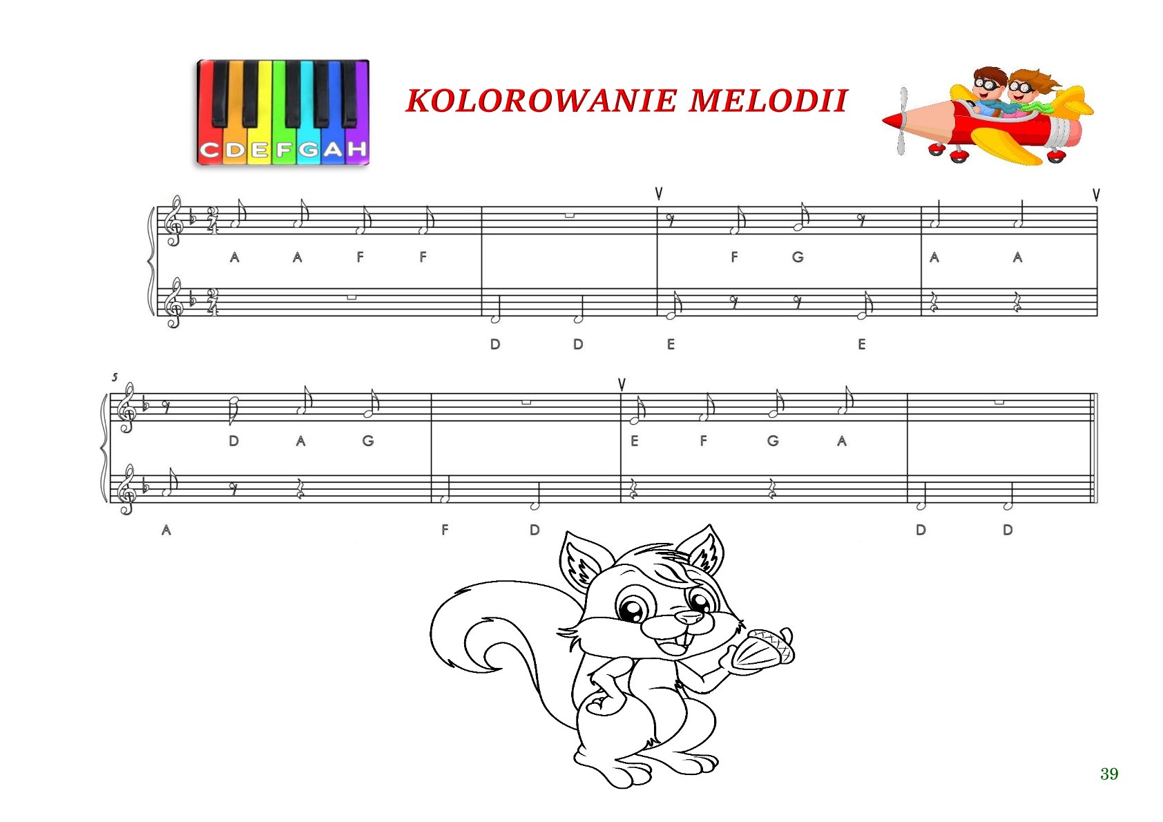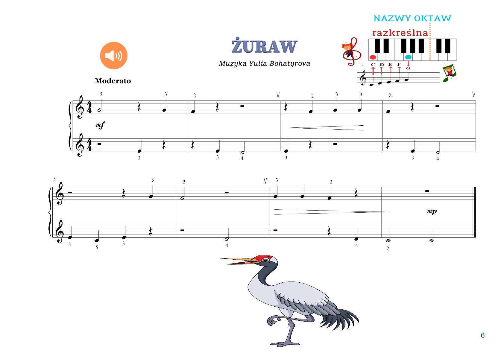 Barwne ilustracje leśnych bohaterów wprowadzają element zabawy, pomagają zapamiętywać nuty pierwszej oktawy i sprawiają, że nauka staje się radością! 🦊🌲