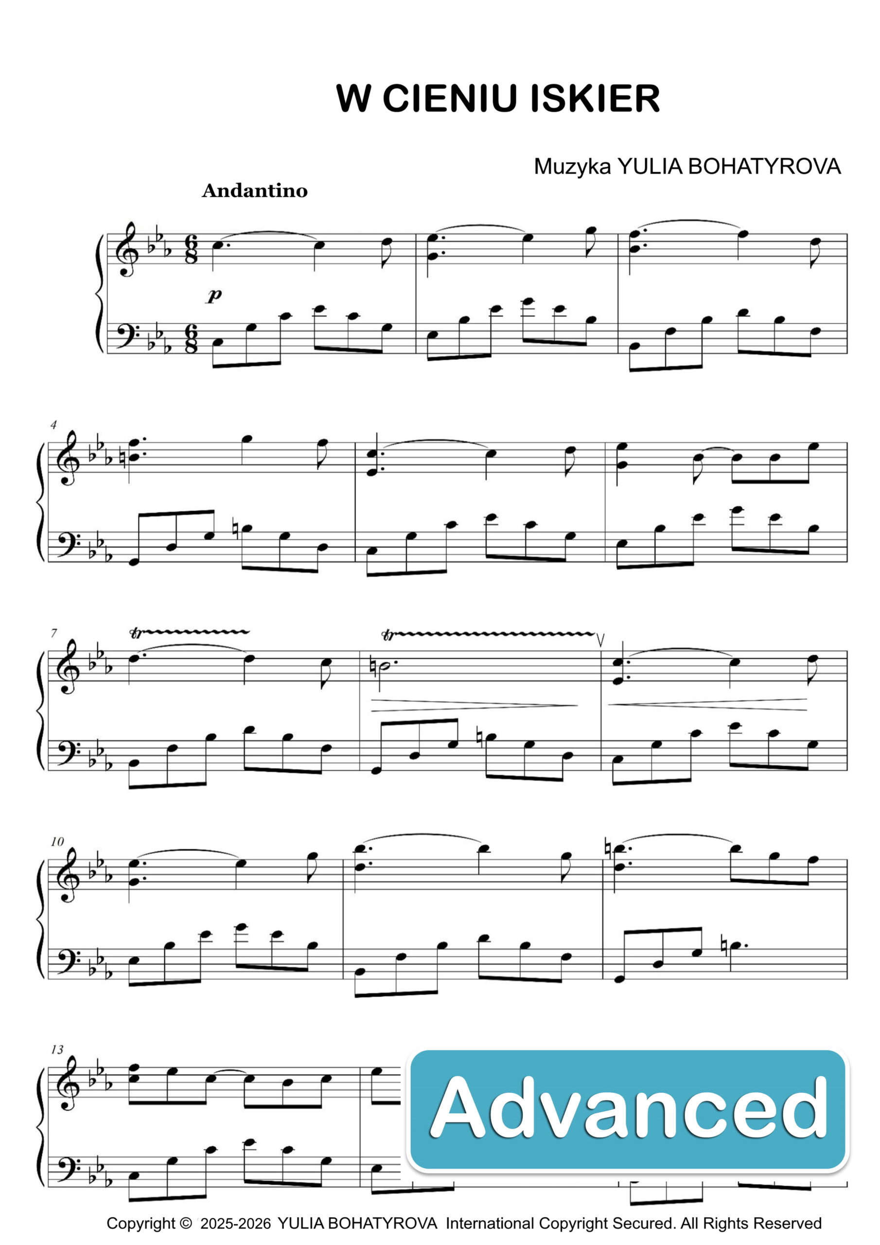 „W cieniu iskier” – utwór fortepianowy solo w formacie PDF. Autorka: Yulia Bohatyrova. Pięciostronicowa, nastrojowa kompozycja dla pianistów zaawansowanych, łącząca warstwowe faktury, subtelne frazowanie i szeroki zakres emocjonalny. Utwór zaprasza do tworzenia sugestywnych obrazów i głębokiej ekspresji w interpretacji. 🎹✨