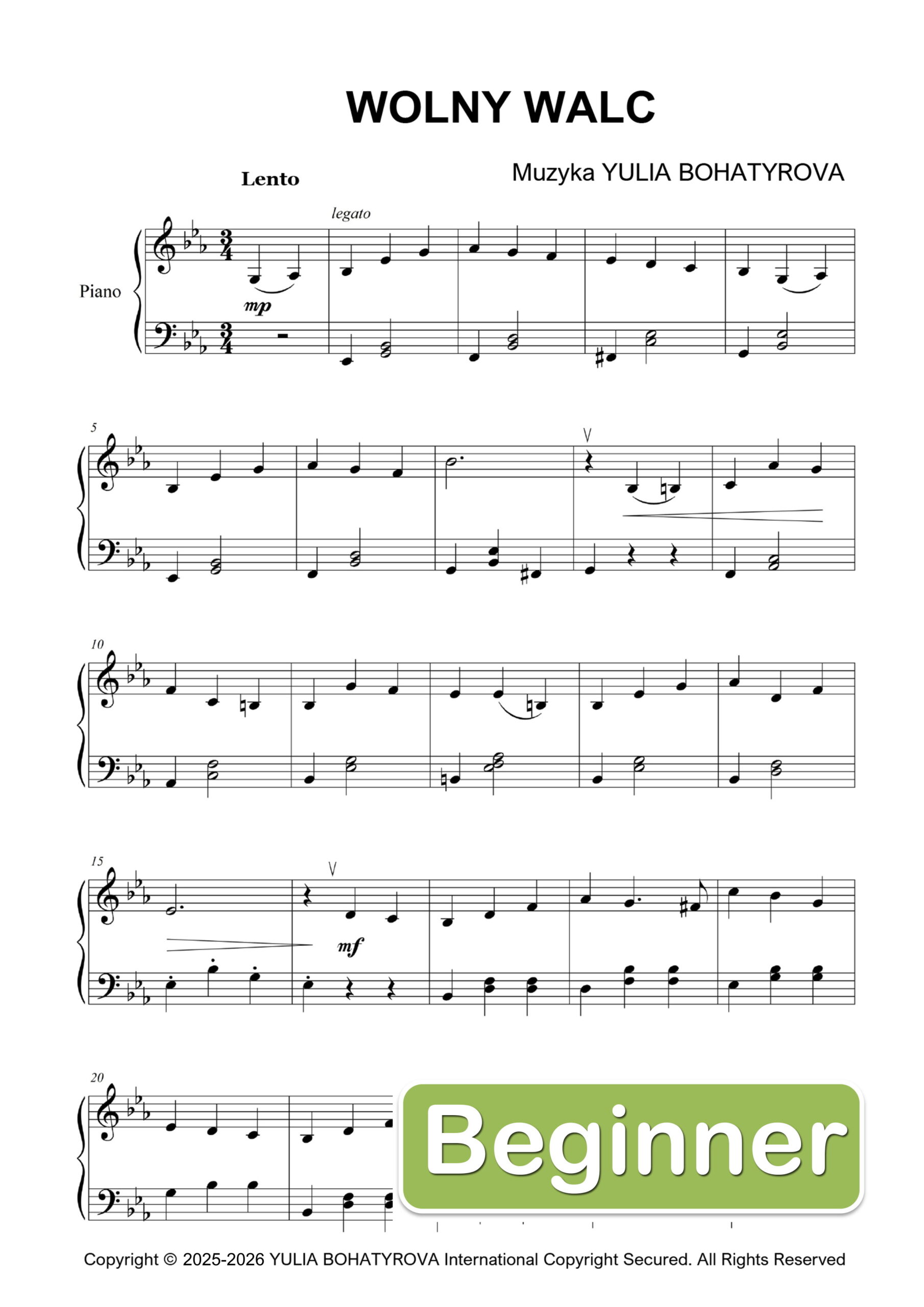 „Wolny Walc” – łatwy utwór fortepianowy solo w formacie PDF. Autorka: Yulia Bohatyrova. Liryczna, dwustronicowa kompozycja idealna dla początkujących uczniów, którzy chcą ćwiczyć elegancję, płynną melodię i delikatny rytm walca. 🎹✨